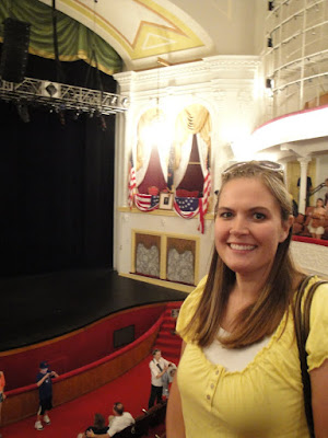 When we headed from the Visitors Center to the actual theater we walked down a hallway. A clock was ticking away the seconds very loudly. On one side of the hallway we read what Lincoln did that day, and on the other side of the hallway we read what Booth did that day. The theater itself was very interesting because the tour guide told us lots of things I never knew before. I learned that nobody questioned Booth being in the theater because he was the "Harrison Ford" of that time. (A very popular well-known actor.) They also told this story: